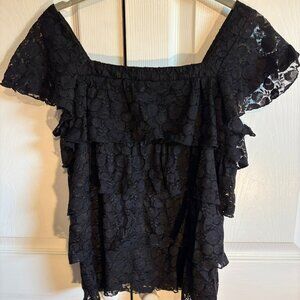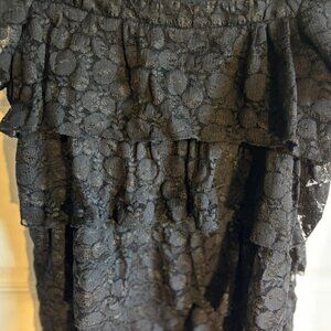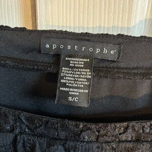 Cute Apostrophe brand Womens Top Sz S; Lace; Black; Ruffle; Cap Sleeve; 22-1/2" long; Lined; 73% Nylon; 27% Rayon; Very good condition; No signs of excessive wear, tears, stains