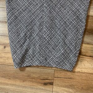 Apostrophe brand skirt, specifically a gray woven tweed skirt with a fringe hem. It's made from a wool blend and has a straight, pencil style, suitable for casual or work settings. The skirt is knee-length, lined, and features a zip closure. The design incorporates a black and white check pattern, creating an overall light gray tone from a distance. Open to offers and bundle items to save!