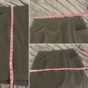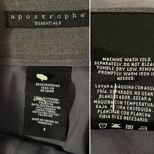 Apostrophe Essentials Pencil Mini Skirt Pockets Grey Size 8. Lined. 2 front side pockets. Back zipper. Small Back slit. Perfect for work! Poly Rayon Spandex been fabric has stretch. Gently used Excellent Preowned Condition.