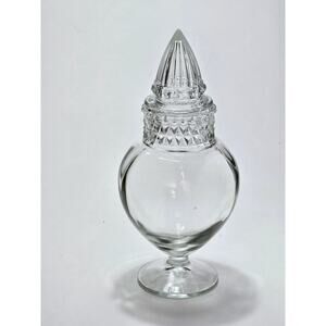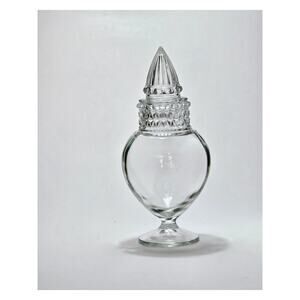 Add a touch of vintage charm to your home decor with this beautiful apothecary jar! Perfect for displaying dried flowers, storing bath salts, or simply as a decorative accent piece. This jar features a classic design with a clear glass body and a stylish lid. It's in excellent condition and ready to enhance any room. Dimensions: 13" tall and approximately 6" wide. No chips or cracks.