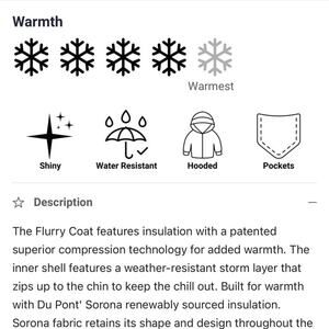 The Flurry Coat features insulation with a patented superior compression technology for added warmth. The inner shell features a weather-resistant storm layer that zips up to the chin to keep the chill out. Built for warmth with Du Pont' Sorona renewably sourced insulation. Sorona fabric retains its shape and design throughout the day and wears after wear and wash after wash.