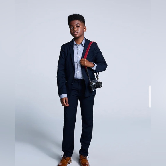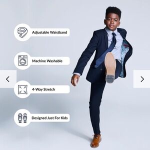 The classic two-piece modern stretch knit suit features a notch-lapel blazer and adjustable waist and hem pants for your little one to wear as they grow! Bonus: It features an attached, contrast pocket square that can be popped out, or tucked in.
