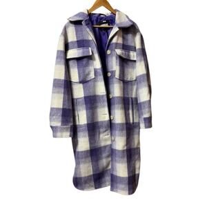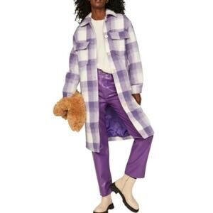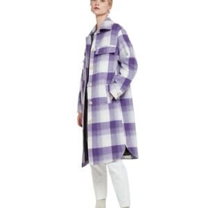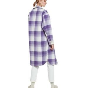 Graham mid-length shirt jacket from APPARIS featuring plaid check pattern, two side inset pockets, two front flap pockets, front button fastening, classic collar, long sleeves, mid-length, curved hem and amethyst purple.