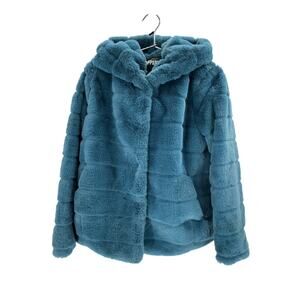 Apparis 'Goldie' Blue Polyester 4.0 Faur Fur Jacket Size S: front snap button closure, attached hood, side slip pockets, super soft faux fur fabric, measurements: 22 inch bust x 24.5 inch length.