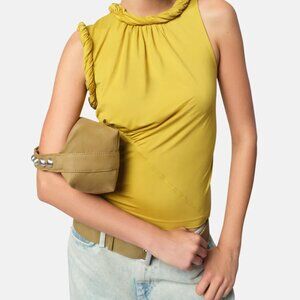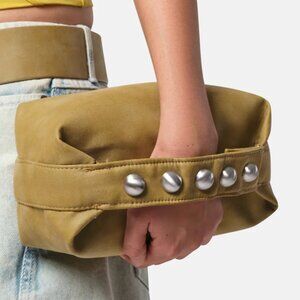 Sueded SANS Leather pochette featuring a studded adjustable strap with dome snaps.