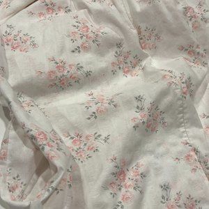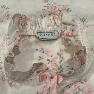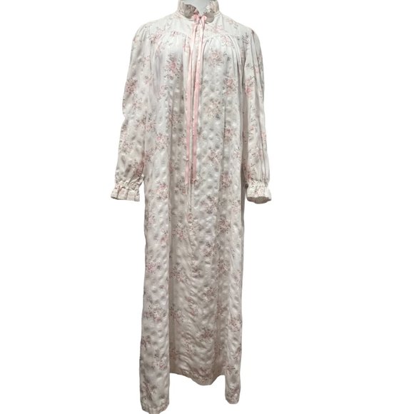 This lightweight full length robe features a zip front, gathered puff sleeves, front yoke detail, long sleeves with elastic cuffs, high ruffled neckline, and pockets. Fabric is a cotton-poly blend. Delicate floral pattern of white and pink, with lace trim and pink ribbons. Excellent condition. Size Medium, based on measurements. Size label print has faded.