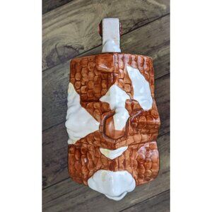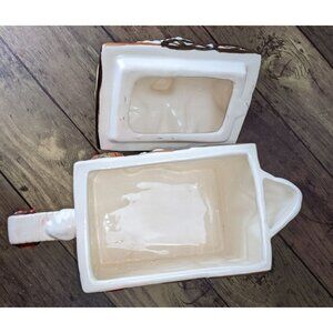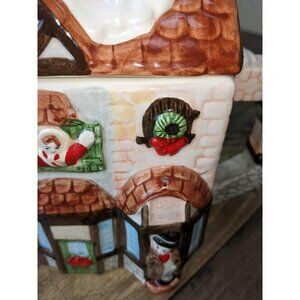 This Christmas themed tea kettle has a lady hanging out the window as well as Frosty The Snowman in one of the doorways. Christmas decorations hung everywhere, this tea kettle is very festive.