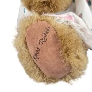Vintage 1985 Applause plush bunny from the Rakes series, featuring a unique wood-carved face and dressed in a charming lace dress with a floral pattern. This collectible bunny measures 12 inches in height and is made from polyester materials. A great addition for collectors of vintage plush toys.
