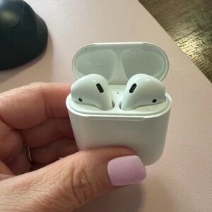 Very clean Apple AirPods 2. No charging cord but comes with charging case. Compact white wireless earbuds with a sleek charging case. Ideal for music lovers.