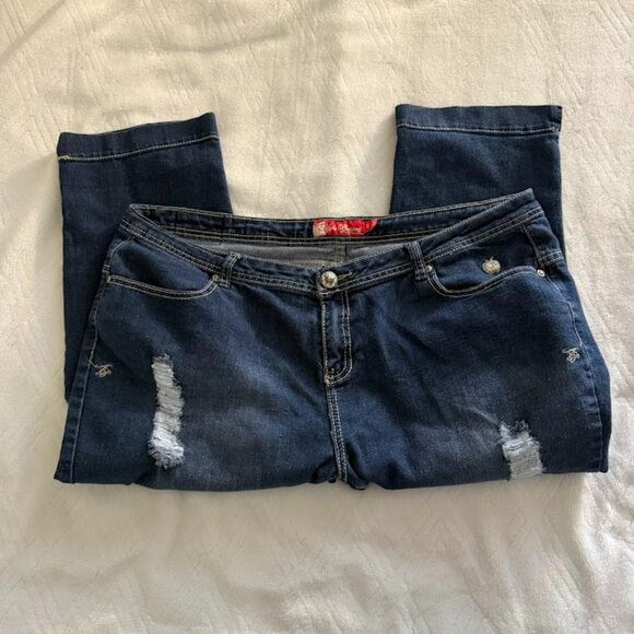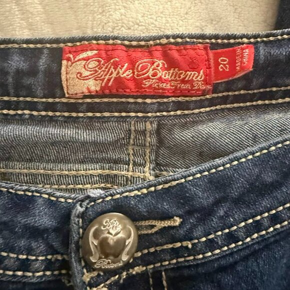 The product is a pair of Apple Bottom Jeans in a women's size 20, designed in a blue distressed color with embroidered pockets. These capri-style jeans feature a comfortable waist size of 44 inches, making them suitable for plus-size women. The brand's signature accents, such as branded buttons and unique pocket designs, add a fashionable touch to this wardrobe staple. The distressed detailing and embroidered pockets make these jeans a stylish choice for casual outings or dressed-up occasions. Ideal for women looking for a trendy and comfortable denim option.