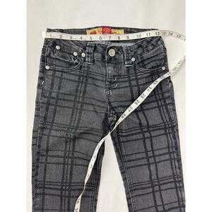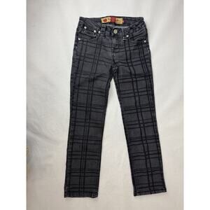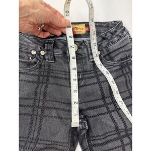 These Apple Bottoms girls' Y2K low-rise jeans are a rare find featuring a black-and-gray plaid pattern with a signature bling embroidery on the back pockets. Designed with stretch for comfort and a flattering fit, these jeans are perfect for adding a retro streetwear vibe to any outfit.