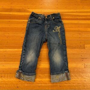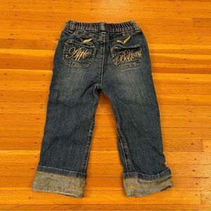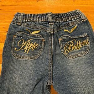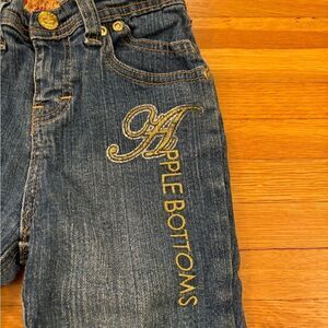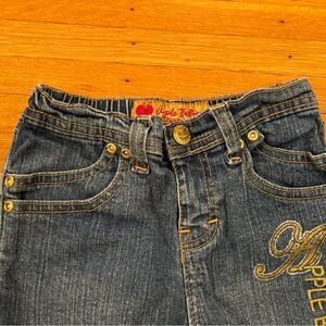 Stylish kids jeans by Apple Bottoms. Classic blue denim with gold embroidery. Perfect for casual wear.