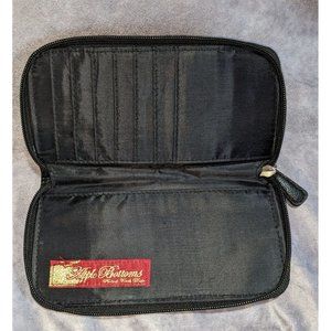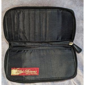 Beautiful and bright special edition rainbow zip wallet by Apple Bottoms. It's made of a black pebbled faux leather with a silver tone plaque on the front that says "special edition denim Apple Bottoms picked fresh daily". The design on the front and back of the wallet is a rainbow checkerboard print with a floral apple design, pink and black piping, and silver tone studs. The inside has two bill pockets and seven card pockets. The inside also has a red and gold Apple Bottoms picked fresh daily patch sewn inside. Super fun!