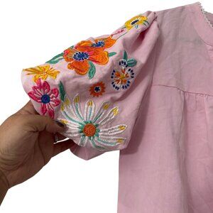 Apple Boulevard Pink Embroidered Puff Sleeve Peasant Blouse Womens Size Medium