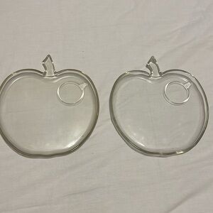 Glass Apple Snack Plates Set of 2. CLear glass, Apple shaped with thick rim. Has indent for cup(cups not included). Dimensions: 8” x 8 3/4”. Very good condition