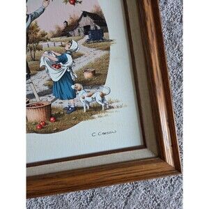 Celebrate the charm of country life with this nostalgic oil painting titled "Apple Harvest" by C. Carson. This framed artwork captures a heartwarming rural scene of a man picking apples from a tree as a young girl and a loyal pup wait below—an idyllic representation of simpler times.