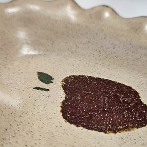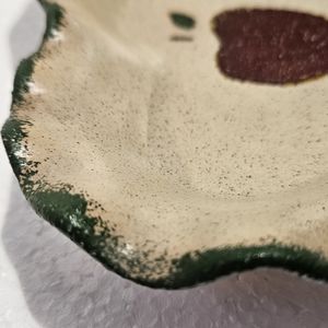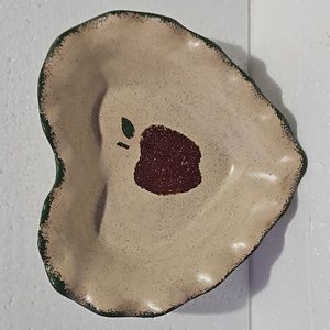 Durably made heart-shaped dish has raised, sponged rim and apple center. Ruffled edges. Please see closet for matching apple pitcher. Would also make a great candy dish or coupe. Great vintage condition, no chips. At its widest and tallest, it is approximately 6.5" tall and 7.25" wide.