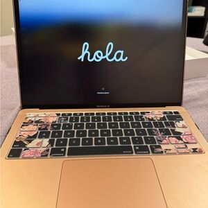 Stylish Apple MacBook Air. Gold finish. Black keyboard with floral design. Ideal for everyday use.