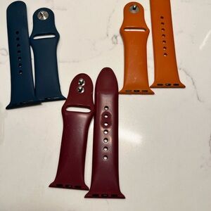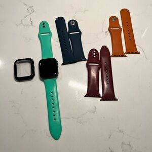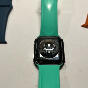 Stay connected with this stylish dark grey Apple smartwatch featuring 4 wrist bands (teal has a tear near magnet connector, the other bands have signs of wear) and black matte plastic watch cover. Perfect for tracking your fitness and staying on top of notifications. Watch is a series 4, 40mm, and has been factory reset. Always worn a protective cover over it, and there are no visible signs of scratches.
