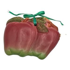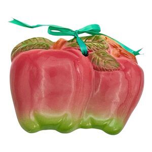 Pair of vintage apples wall plaques with ribbon hangers, made of ceramic and porcelain in a Mid-Century. The multi-color Red design adds a charming touch to any decor, while the pottery material adds a touch of nostalgia. They are in good condition, with some small flea bites, but no cracks, both measure 7in Wide x 6in Tall. Both are the same color, lighting sometimes shades the color. See pictures.