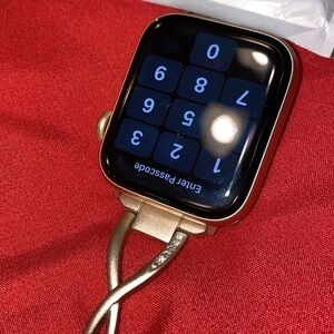 Apple iWatch band. Two piece rose gold bracelet style band features a clasp fastener.