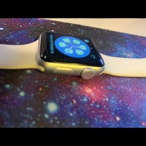 Apple Watch with sports band, size S/M. It’s still in great shape, can be put to great use! Everything works perfectly, Bluetooth, touch screen, Siri commands, fitness and calorie tracker. Please let me know if you have any questions. I will ship with original box I bought it with.