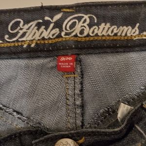Apple bottoms jeans. Cotton-68%, Polyester-30%, spandex-2%. Size-9/10. Tiny rhinestones on the back pockets.