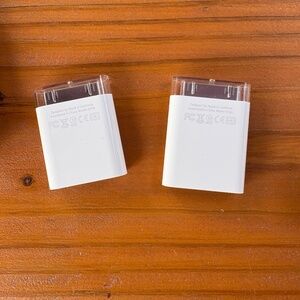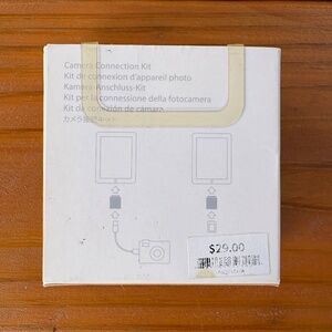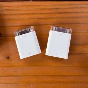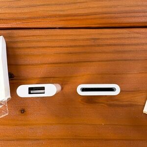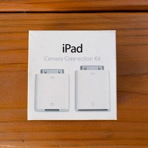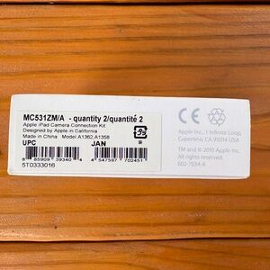 Apple iPad camera connection kit MC531ZM/A. These are for the older Apple iPad 30 pin connection. One is to connect an SD card directly to iPad and the other is to connect an USB cable from a camera or other device directly to iPad. From 2010, still has the cap protectors on.
