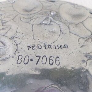 The image shows a round "Peltrina" brand serving plate, likely made of cast aluminum with a pewter-like finish. It features a design of apples and leaves around the edge, with openwork sections between the fruit. The center of the plate is plain except for the stamped text "PELTRINA" and "80-7066". The plate is likely vintage, possibly from the 1990s. Peltrina is a brand known for metalware from Argentina, and their pieces are noted for being durable and thicker than similar items from other makers.