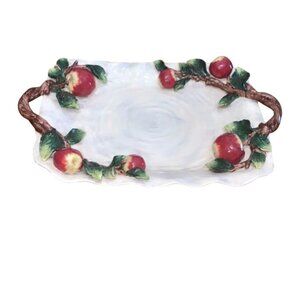 Crafted with intricate apple designs and vibrant colors, this ceramic serving platter serves as an eye-catching centerpiece. Sturdy handles offer ease in carrying, while its ample size accommodates a variety of dishes, enhancing your dining presentation with its charming apple motif.