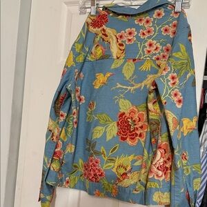 Chic floral jacket with vibrant colors. Features button-up front. Ideal for stylish layering.