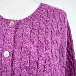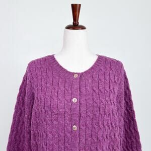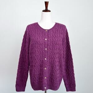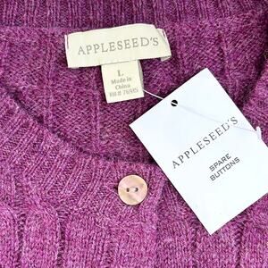 Size Large Appleseed's cardigan. Listing as NWT since extra button bag is still attached. Cable knit design in a purple/pink colorway. Pretty buttons. No flaws, never worn!