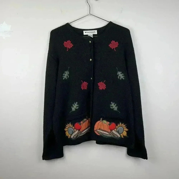 Celebrate the cozy fall season with this delightful Appleseeds cardigan designed for comfort and style. Crafted from 100% acrylic, it features beautiful embroidered decorations of vibrant leaves and a charming harvest scene at the bottom. Perfect for layering, this cardigan has a classic button-up design and roomy pockets to keep your hands warm. Ideal for casual outings or a festive gathering, it's an essential addition to your autumn wardrobe.