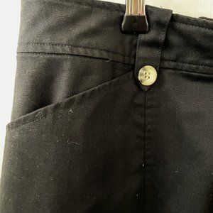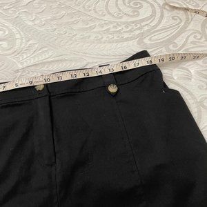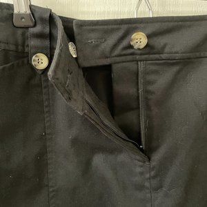 Black chambray skirt from Appleseed’s. Front zip & button closure. 4 belt loops. (Buttons on belt loops are decorative only.) 2 front slash pockets. Made to sit below the waist. Measurements: waist is 37”; length is 23”. Size is 18P. Fabric is 60% cotton; 40% polyester. Machine wash cold; tumble dry low. Skirt is in perfect condition – no rips, tears, stains or missing buttons. Zipper works perfectly.