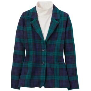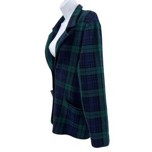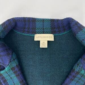 Appleseed's green and blue plaid sweater sport blazer for women, size medium. Features a relaxed two-button front, soft jacquard sweater knit, notched lapels, silver-rimmed enamel buttons, and welt pockets. Hip-length.