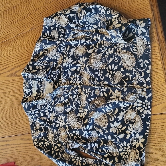 a cobalt blue jacket with tan and white floral and paisley pattern.