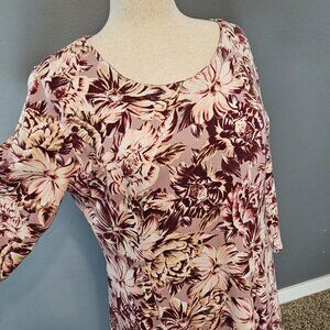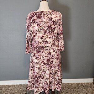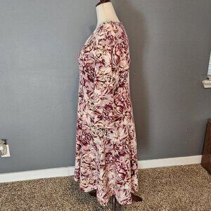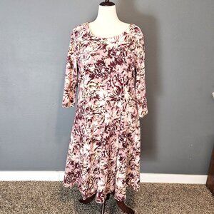 Lovely Appleseed’s dress in size XL, perfect for cottagecore or boho-inspired wardrobes. Features a romantic pink and burgundy retro floral print, scoop neckline, and 3/4 sleeves. The flowy A-line silhouette and 42” length give it a feminine, vintage-inspired charm that’s both modest and flattering. Soft, stretchy fabric makes it comfortable for everyday wear, garden parties, or casual chic outings.
