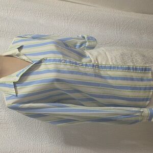 Stylish button down top with pastel blue and light green stripes. Perfect for casual wear. Size 8 women's, 60% cotton, 40% polyester. Feel free to ask any questions!