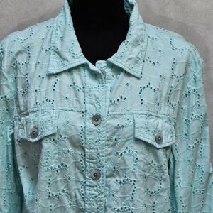 Appleseed's Petite Light Teal Eyelet Button Up 100% Cotton Jacket Sz PXL