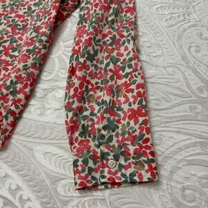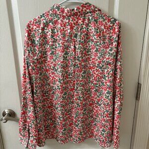 This is a gorgeous watercolor print in coral rose & moss green on an off-white background. This pop-over top features a “Y” collared neck, long sleeves with button-tab roll cuffs, a breast pocket, an inverted back pleat, and shirt-tail hem. The fabric is 98% cotton and 2% spandex. Machine wash in cold water; tumble dry low. The size is PXL and measurements are 23.5” armpit to armpit (across the back), 17.5” underarm sleeve length, and 26.5” center back length. This shirt was worn only once and is in perfect condition.
