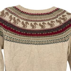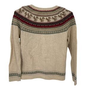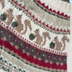 Gorgeous tan fair Isle sweater with a squirrel pattern and 3-D nuts. Greens reds and browns make up the fair isle. Size petite small in excellent condition. Laid flat it measures approximately 18 inches armpit to armpit and the length on the top of the shoulder down the back 23 inches.