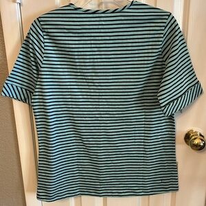 Appleseeds Women’s (S) Light Blue/Navy Striped Double Button Front Pullover NWOT Top. Cuffed and button, 1/4,length sleeves. 100% Cotton. Extra Button Included.