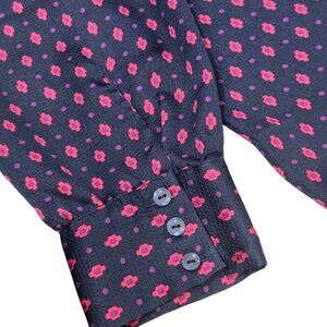 Appleseeds Womens Satin Navy & Pink Patterned Button-Down Blouse SZ 16 High Neck