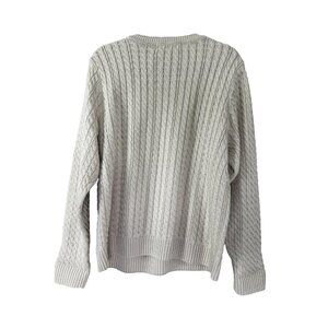 Appleseeds Women’s Ivory Cableknit Sweater Fisherman Preppy Nautical Coastal. Appleseeds Women’s Ivory Cableknit Sweater. Features a classic fisherman-inspired cable knit design with ribbed cuffs, hem, and crew neckline. Soft cotton blend fabric adds cozy preppy coastal charm. Timeless nautical aesthetic perfect for layering in cool weather. Pit to pit 22" and length 25". Excellent, pre, love condition - size, content & origin tags are missing and all estimated. Check Measurements.