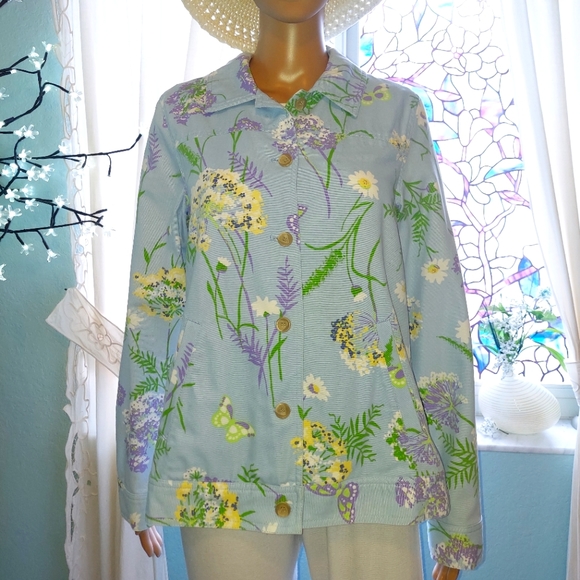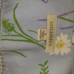 Jacket #7 Appleseed's jacket size small. 100% cotton, Jean like material. Button down front and cuff closure. Bright blue with floral designs. Cute little jacket shows almost no wear. Kept in a smoke free and pet free home.