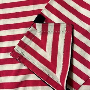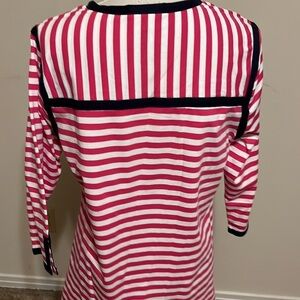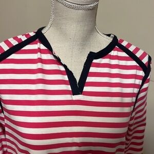 Appleseed’s t shirt with red and white stripes with navy blue binding trim. 3/4 sleeves with binding around opening. Binding surrounds side opening . New without tag . Size medium . Runs long at 27”. 95% cotton, 5% spandex