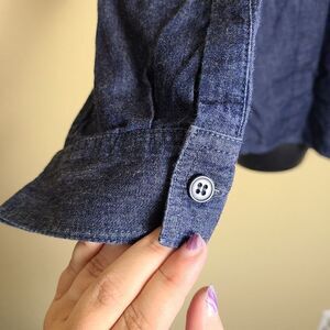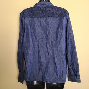 This is a blue denim jacket by Appleseed's. On the shoulders and back are crochet detailing. There are buttons on the front of this jacket and on the cuffs.