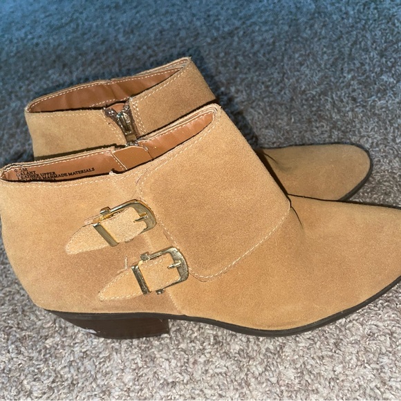 Step out in style with these chic tan suede ankle boots. Featuring elegant buckle details, these boots are perfect for any occasion.