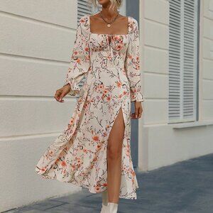 Apricot Boho Allover Floral Print Flounce Sleeve Knot Front Split Thigh Dr…