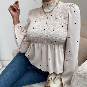 Apricot Boho Heart Print Bishop Sleeve Stand Collar Frill Trim Ruffle Hem Blouse